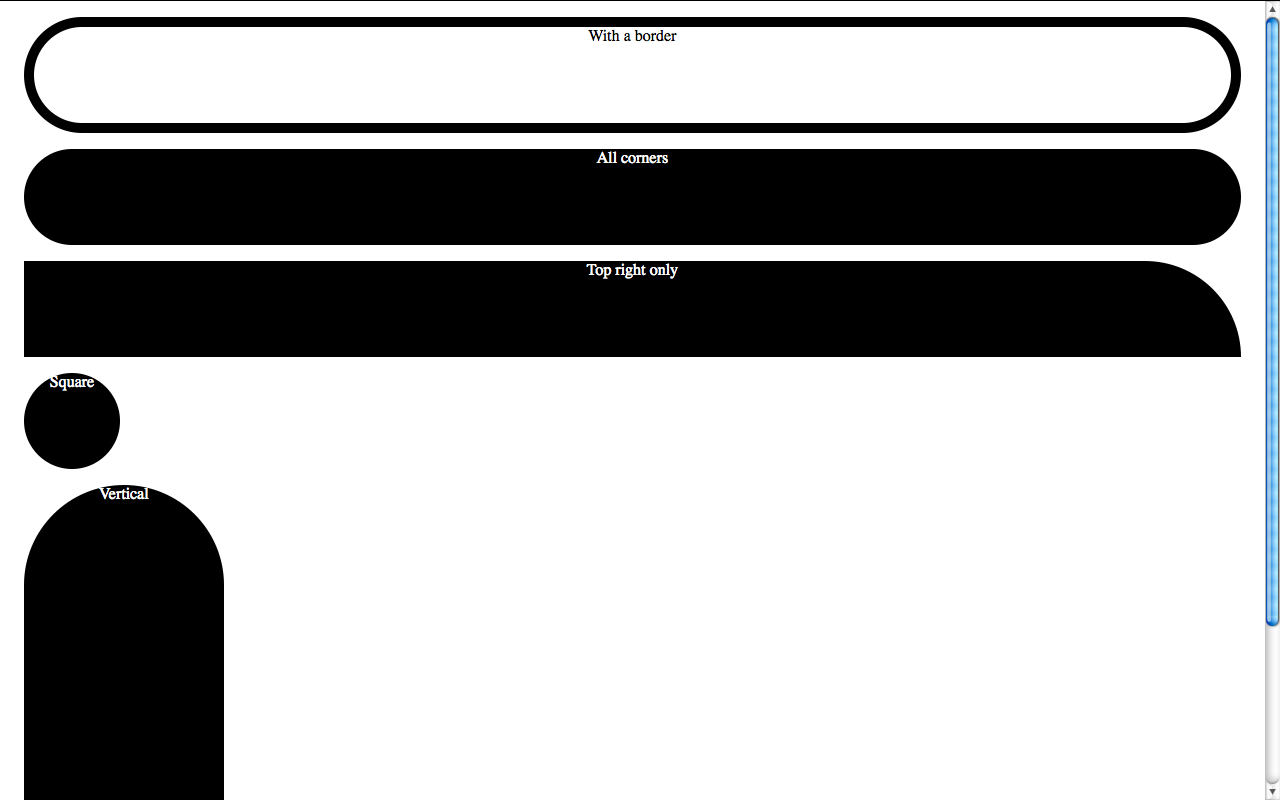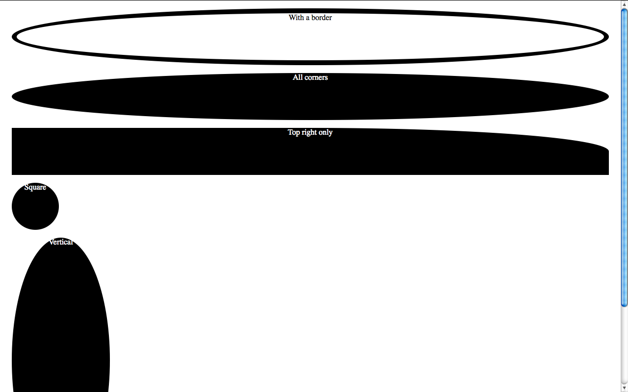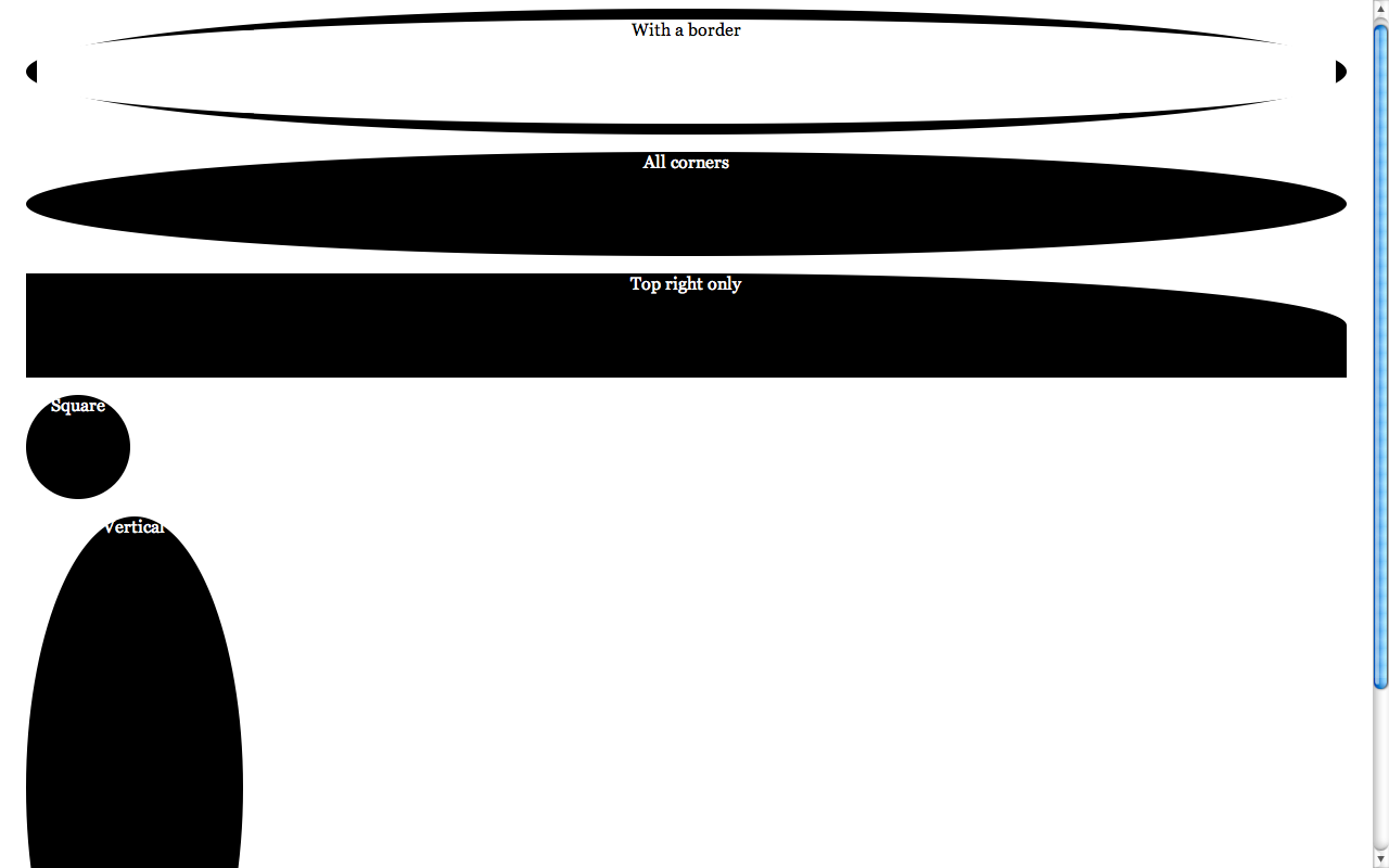 As you will see below, Firefox used to have a bug, or actually a different interpretation of the spec, which I think is a quite commonly needed use case, even more than ellipses: It always drew a regular curve for the corners (quarter of a circle) with the maximum possible radii. This is a very commonly needed shape in UI design. If you’re using OSX, you’re seeing it everywhere: the buttons, the scrollbars, even Skype (notice the blue or grey shading around the usernames in a chat). As I’m writing this post, I can see the same shape in the buttons of Wordpress’ admin panel. And as the current spec stands, there’s no way to do that. You have to know the height (or width, if you want a vertical shape) in advance, which even when possible, makes border-radius depend on the value of other attributes (such as line-height) and you have to remember to change it every time you change those, which causes maintenance headaches. And what’s worse is that the Backgrounds & Borders module is almost done, so it’s quite unlikely that this will change anytime soon. :(