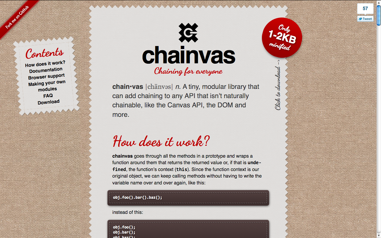 Actually, while using Chainvas myself, I found it immensely more useful for chaining DOM methods and setting multiple element properties at once. Chainvas had a lot of potential, that most people were missing. And then it dawned on me: I should modularize the library! A generic chaining library at its core and additional modules for making the different APIs chainable. And I did it.