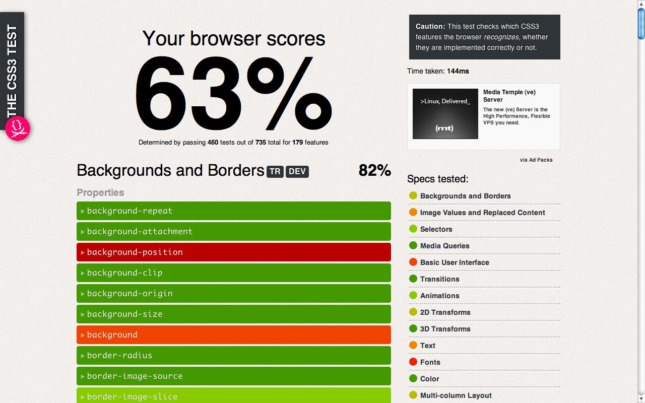 Chrome may display slightly different scores (1% difference) across pageloads. It seems that for some reason, it fails the tests for border-image completely on some pageloads, which doesn’t make any sense. Whoever wants to investigate, I’d be grateful. Edit: Fixed (someone found and submitted an even crazier workaround.).