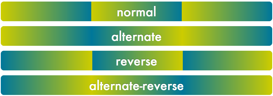 The latest draft also adds two more values: reverse which reverses every iteration and alternate-reverse, which is the combination of both reverse and alternate. Here is a summary of what kind of progression these four values would create for the animation above: