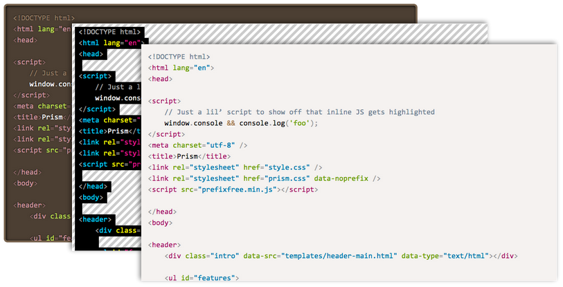 <pre>(on its own) or<script>. Prism forces you to use the only semantically correct element for marking up code:<code>. On its own for inline code, or inside a<pre>for blocks of code. In addition, the code language is declared through the way recommended in the HTML5 draft: through a language-xxxx class. - One of its best features: The language definition is inherited. This means that if multiple code snippets have the same language, you can just define it once, in one of their common ancestors. Obviously, if you define a language on the