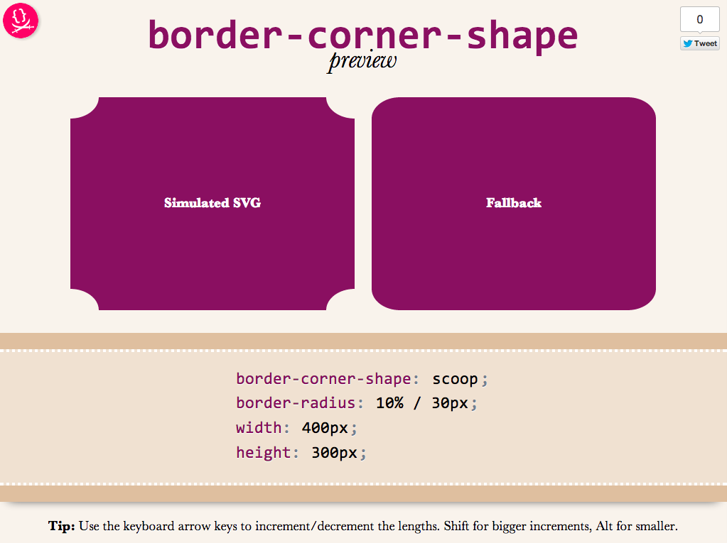 Unfortunately, until it’s implemented in browsers, it’s hard to play with it. Or, is it? I spent the weekend creating an app in which you can enter values for corner-shape, border-radius, width, and height, and see the result, simulated through SVG, as well as the fallback in browsers that don’t support border-corner-radius (which is currently all browsers).