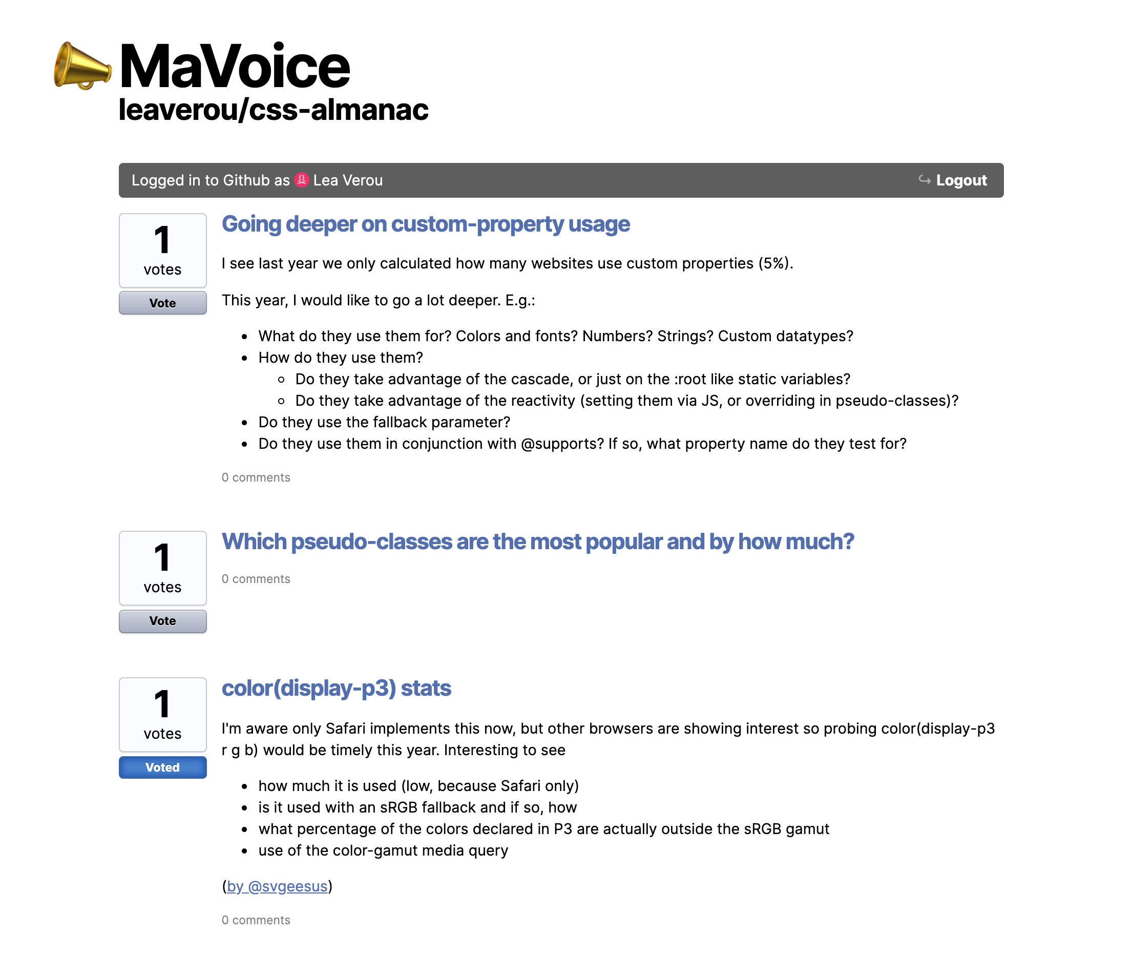 You can set it to any repo via the repo URL parameter, and any label via the labels URL param (defaults to enhancement) to create a customized URL for any repo you want in seconds! For example, here’s the URL for the css-almanac repo, which only displays issues with the label “proposed stat”: https://projects.verou.me/mavoice/?repo=leaverou/css-almanac&labels=proposed%20stat