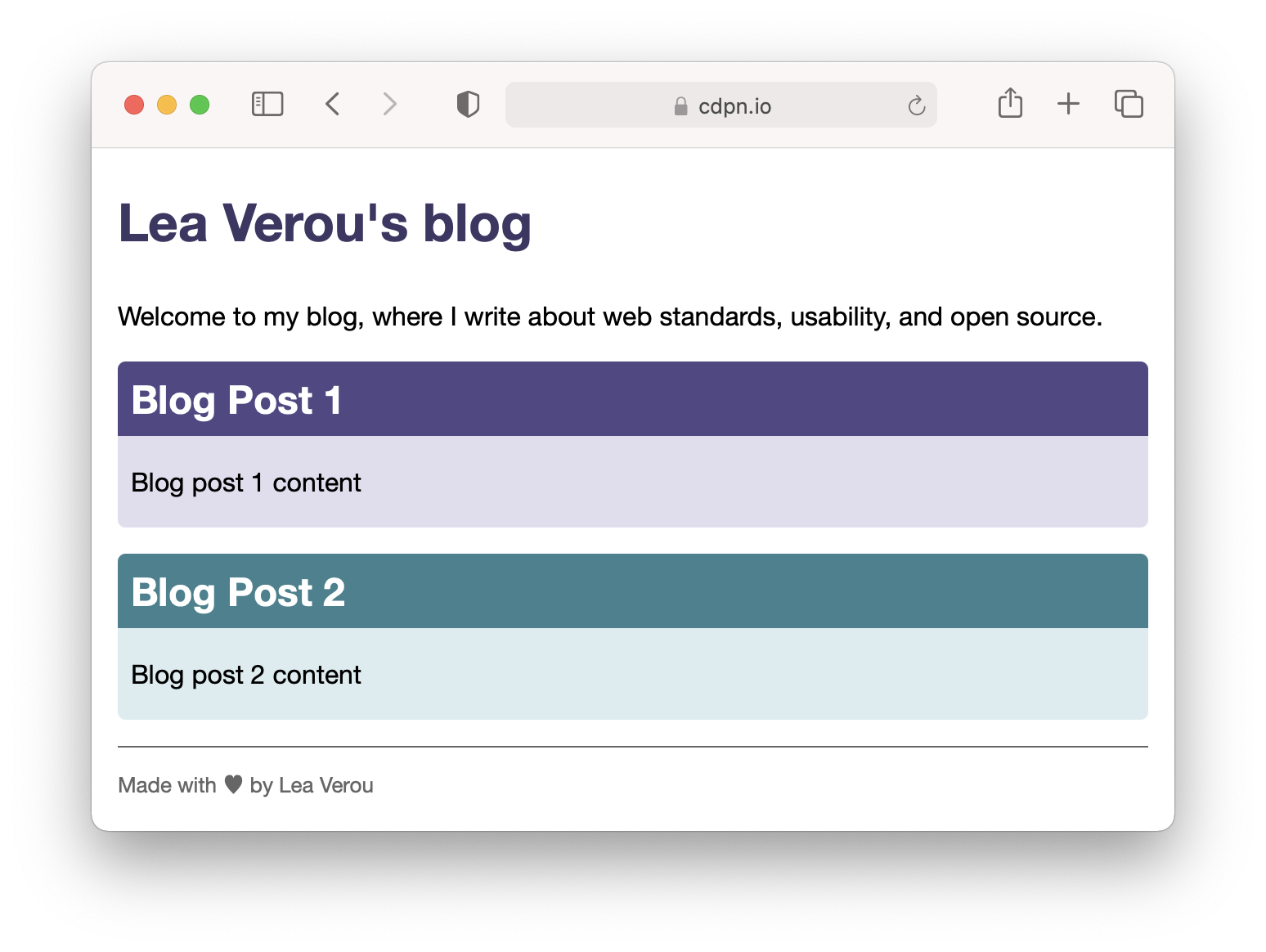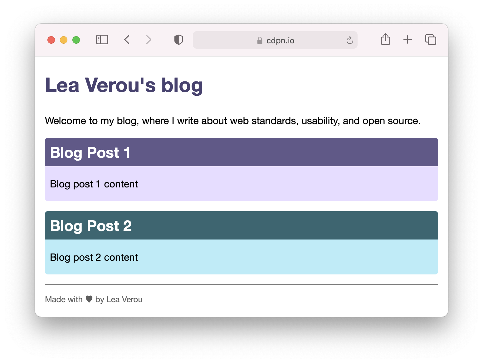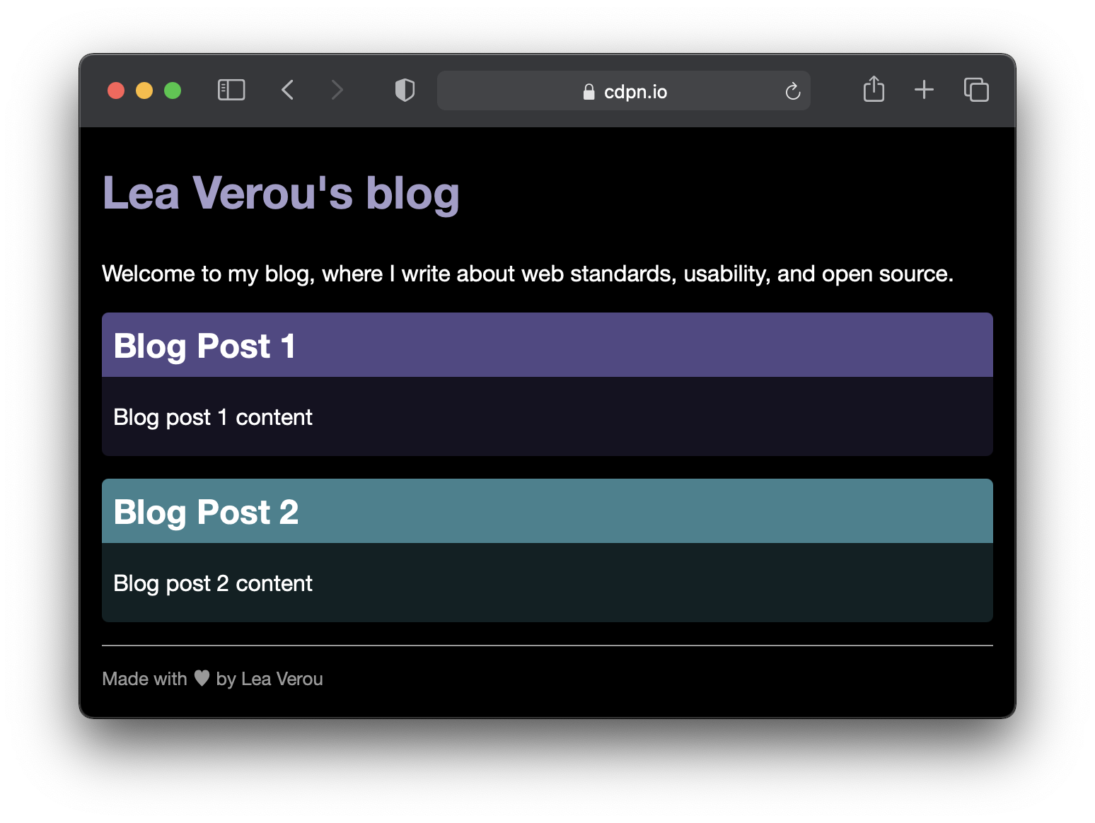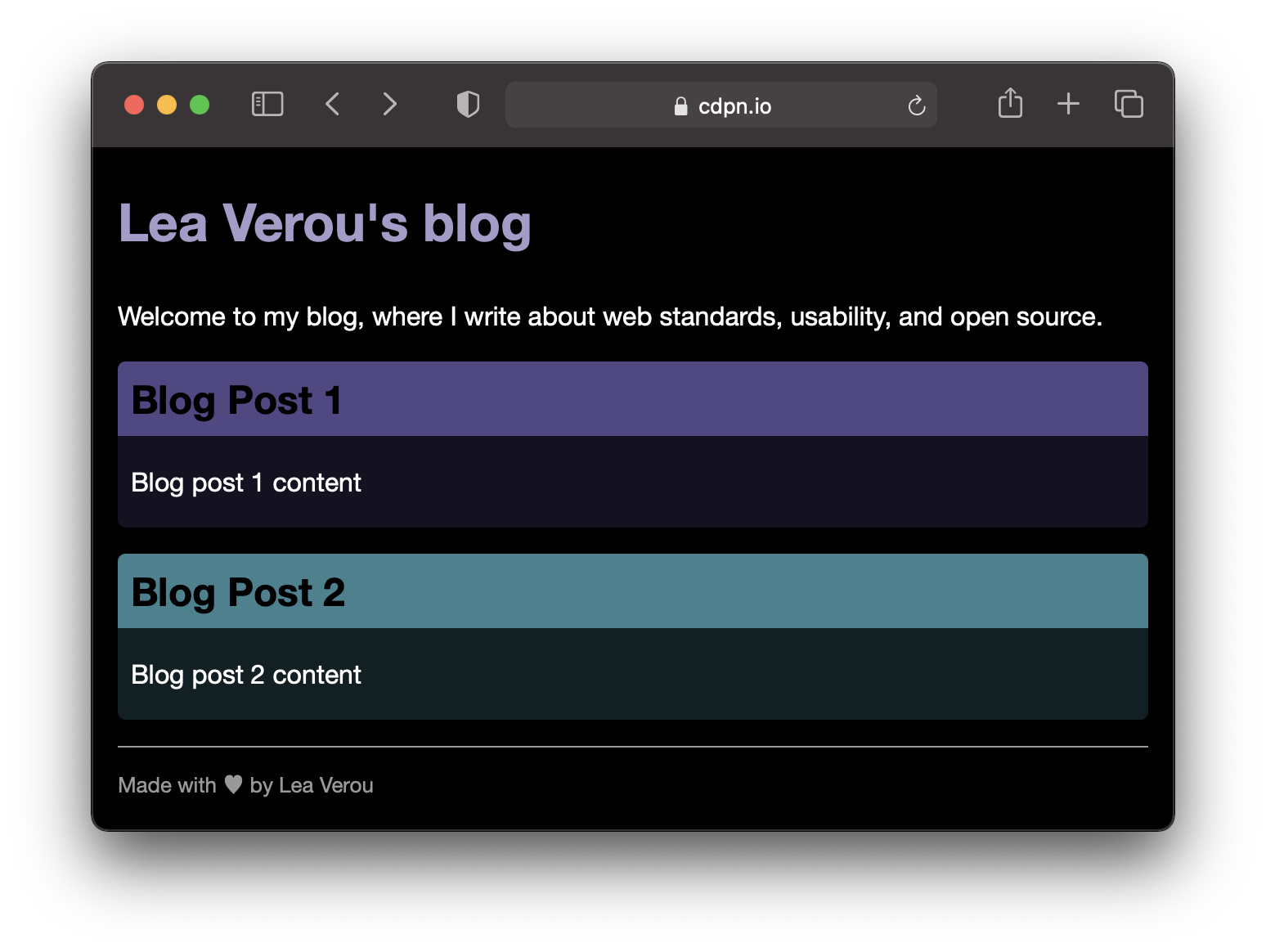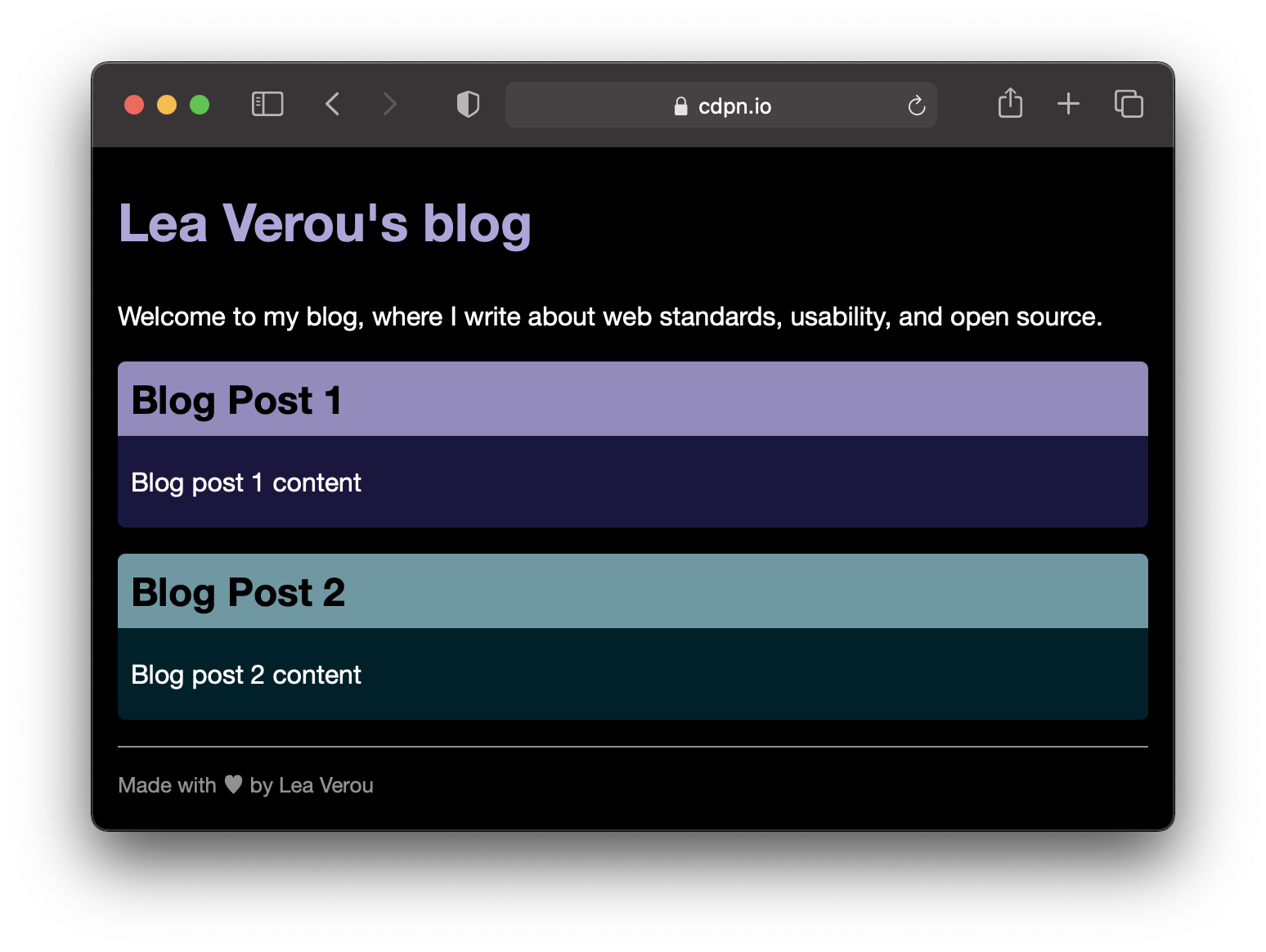 Note that here we indiscriminately replaced all lightnesses with lightness variables. In reality, we don’t need to be quite as sweeping. For example, the article titles would actually look better and would have better contrast if we just kept them the same: