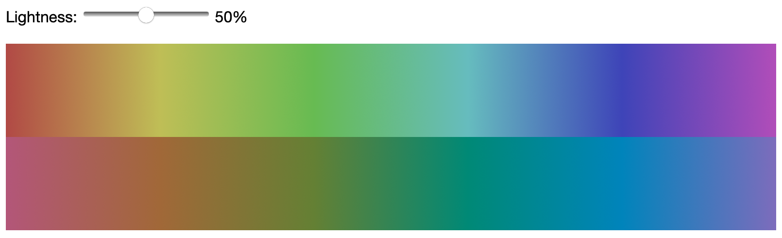 This next example needs Safari TP 120+ . Compare these two gradients, the top one showing various HSL colors all with lightness 50%, and the bottom various LCH colors, all with lightness 50%. You can even adjust the slider and try different lightnesses:
